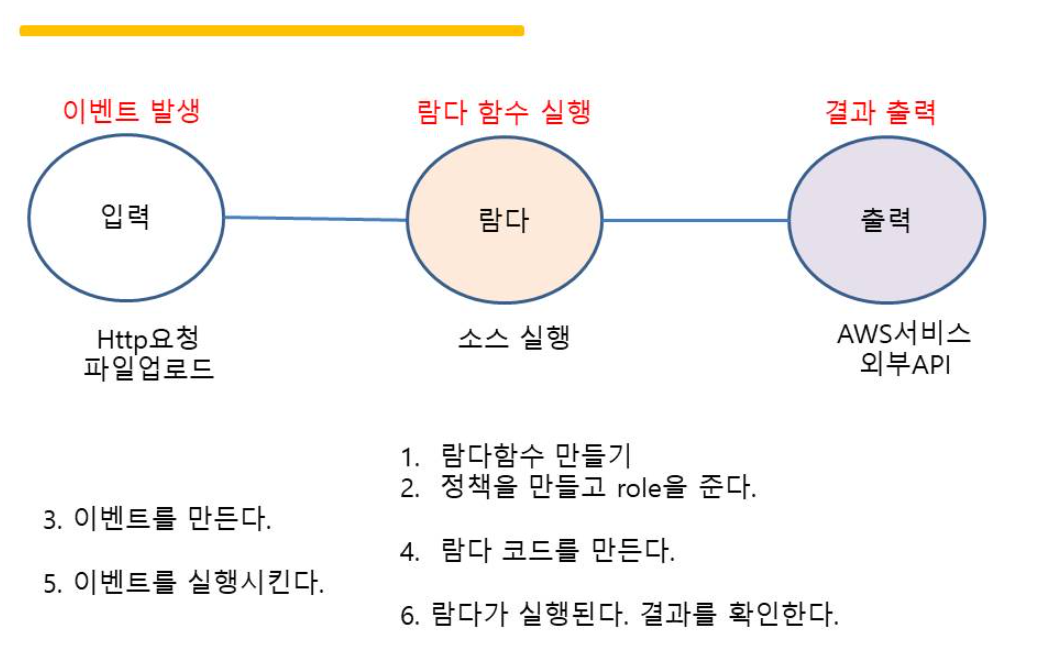 AWS Lambda(람다)는 이벤트에 대한 응답으로 코드를 실행하고 자동으로 기본 컴퓨팅 리소스를 관리하는 서버리스 컴퓨팅입니다. 여기서 '이벤트에 대한 응답으로 코드를 실행'한다는 말은 쉽게 말해 특정 상황이 input 되었을 때 람다 함수를 실행한다는 의미이다.