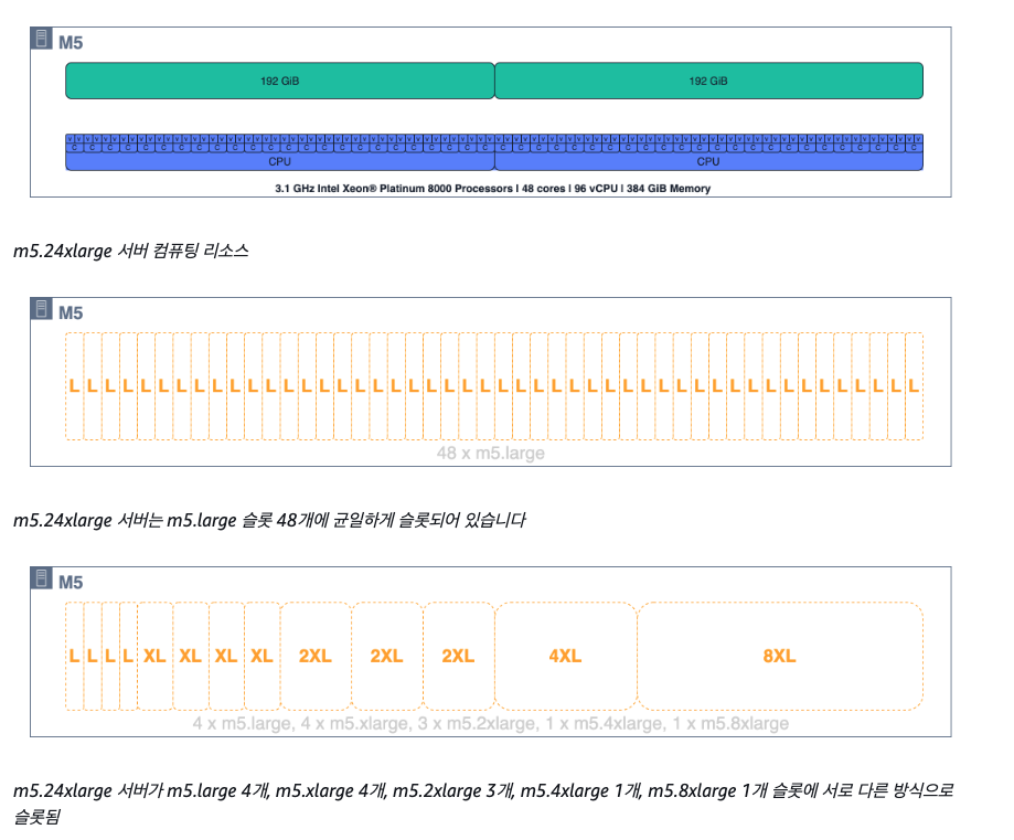 위에서 언급한 Outpost의 "용량"에 대하여 EC2 서비스를 예를 들어 살펴보자, 만약 M5 서버를 한 대를 빌린다면 이러한 서버의 인스턴스 슬롯은 아래와 같이 "일정 인스턴스 크기"에 대한 슬롯 여러 개 또는 "다양한 인스턴스 크기"의 슬롯 여러 개 로 이루어져 있다.