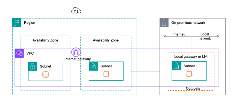 AWS Outposts를 사용한다는 것은 AWS 리전의 Amazon VPC에 대한 해당 리전(*Outpost가 설치되는)에서 액세스할 수 있는 인터넷 게이트웨이, 가상 프라이빗 게이트웨이, Amazon VPC Transit Gateway, VPC 엔드포인트 등의 VPC 구성 요소등을 Outpost(온프레미스에 위치한)로 확장하는 것을 말한다.