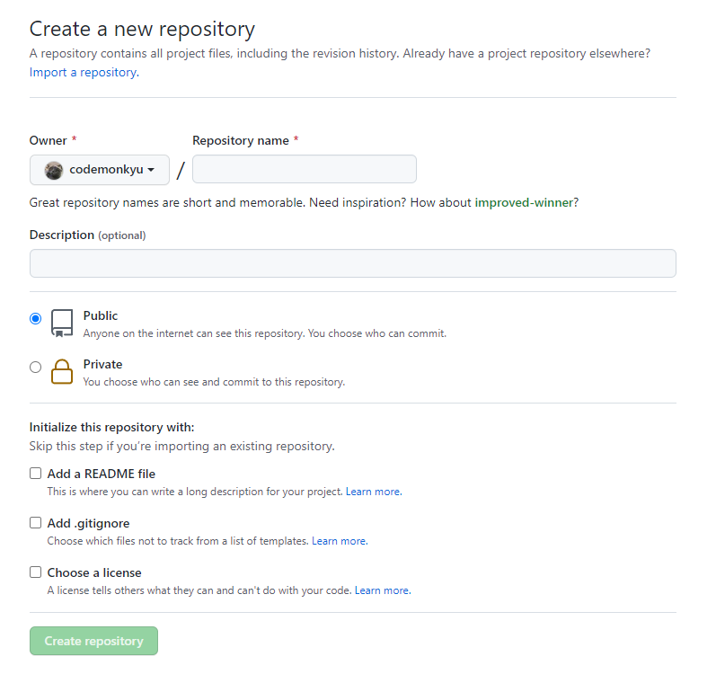 new 버튼을 클릭하면 create a new repository를 할 수 있는 페이지로 넘어간다.