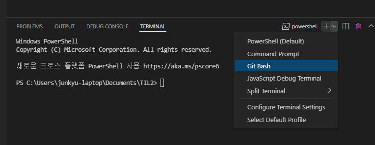 이후 ctrl + ` 를 하여 터미널 창을 열고 입력 프로그램을 git bash로 바꾸어준다.