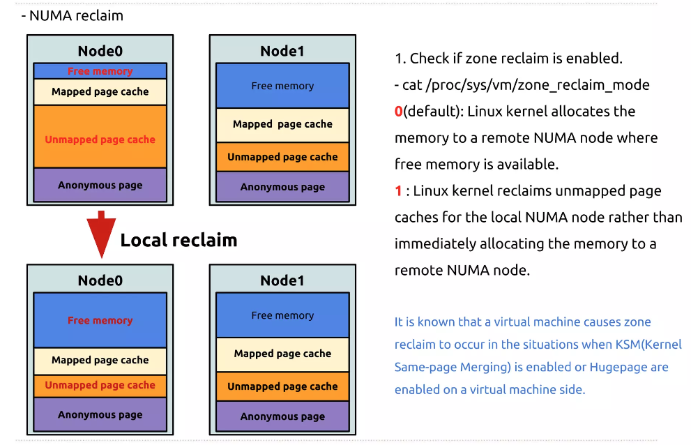 반대로 로컬 메모리에 대한 액세스가 더 중요한 경우, vm.zone_reclaim_mode 값을 "1"로 설정하여 동일한 노드에서 메모리를 할당받게 해준다.