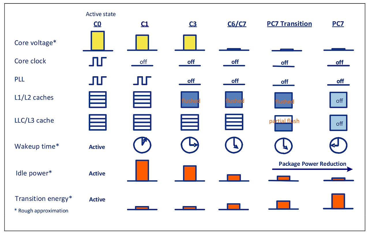 C-state는 위의 설명과 같이 CPU가 가지고 있는 여러가지 전력 모드이다. CPU에 여러개의 코어가 존재하는 경우 모든 코어가 유휴 상태에서 깨어나 있을 필요가 없을 수 있기 때문에 유휴 상태로 전환되는 코어들은 상황에 따라 특정 C-state 모드로 전환될 수 있다. 더 깊은 유휴 상태로 빠질 수록 해당 코어가 다시 100%의 성능으로 전환되기 위해서는 더 많은 시간(*지연)이 발생하게 된다. 아래의 그림을 참고하면 C-state의 메커니즘을 이해하는데 도움이 될 수 있다.