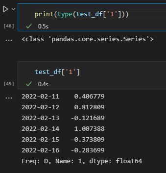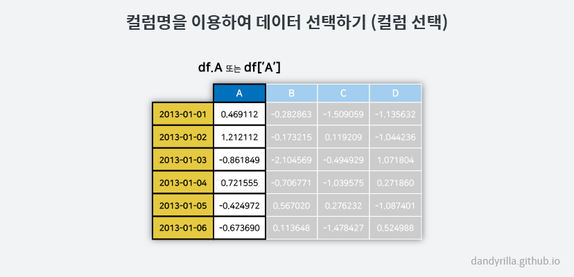 - 데이터 프레임 자체가 갖고 있는 [] 슬라이싱 기능을 이용하는 방법입니다. 특정 ‘칼럼’의 값들만 가져오고 싶다면 df ['A']와 같은 형태로 입력합니다. 이는 df.A와 동일합니다. 리턴되는 값은 Series의 자료구조를 갖고 있습니다.