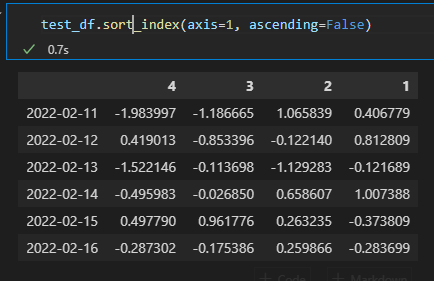 - 그리고. sort_index()라는 메서드로 행과 열 이름을 정렬하여 나타낼 수도 있습니다. 정렬할 대상 축을 결정할 때에는 axis를 이용합니다. axis=0라고 써주면 인덱스를 기준으로 정렬하며(기본값), axis=1라고 써주면 칼럼을 기준으로 정렬합니다. 정렬의 방향에 대한 파라미터는 ascending를 이용합니다. ascending=True는 오름차순 정렬을 하겠다는 것이고(기본값), ascending=False는 내림차순 정렬을 하겠다는 의미입니다. 다음은 칼럼에 대하여 내림차순 정렬을 하는 예제입니다.