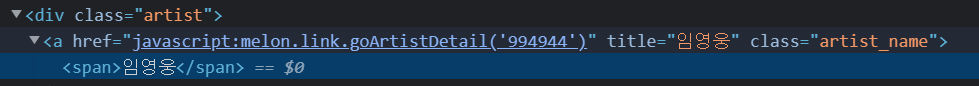 크롬 개발자 모드(F12)에서 노래정보를 담은 <div>tb_list</div>에서<a tag>를 찾을 수 있다.