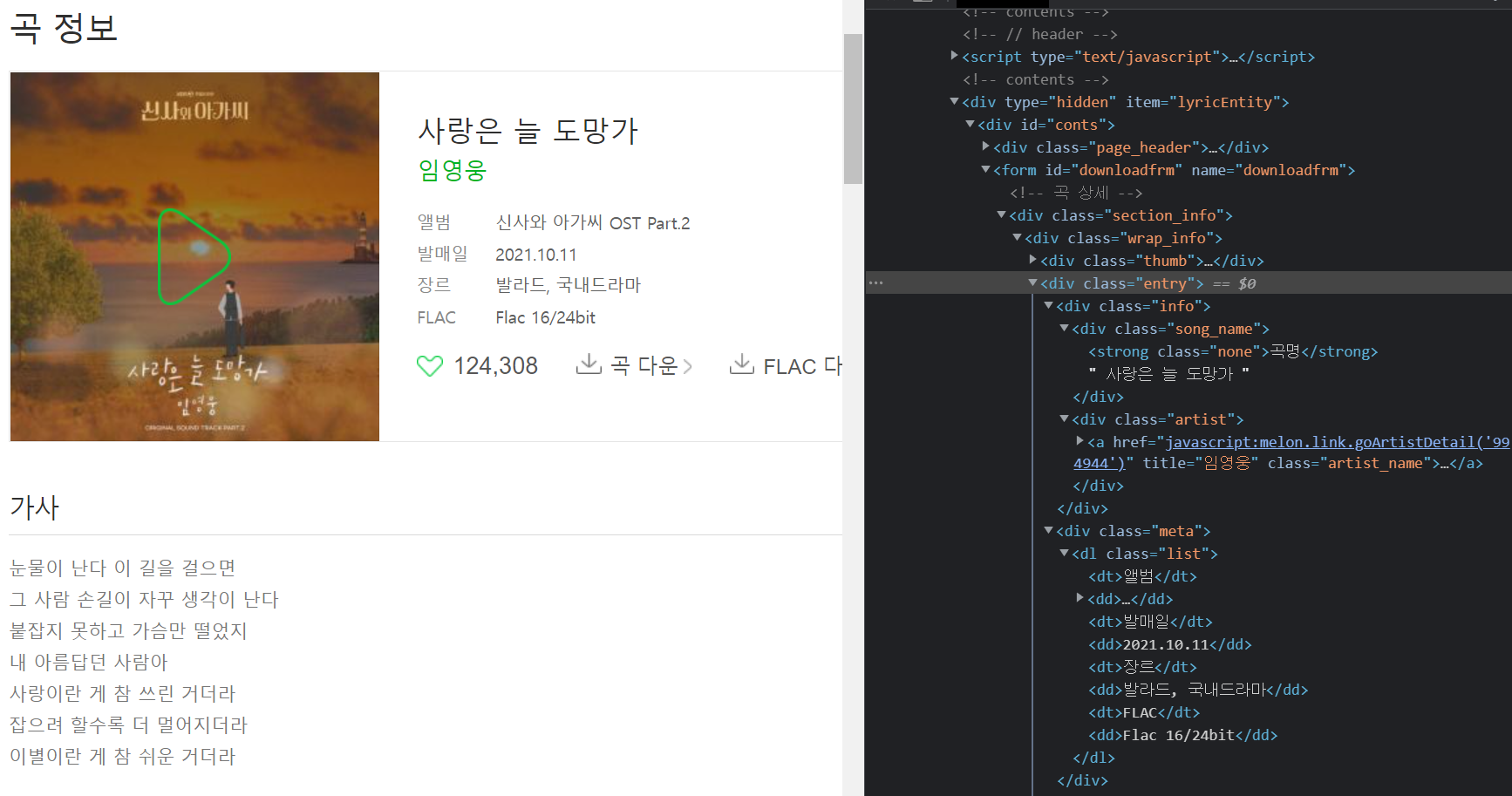 평소처럼 해당 곡을 나타내는 웹페이지에서 개발자모드로 들어가 찾아내려고했다.
