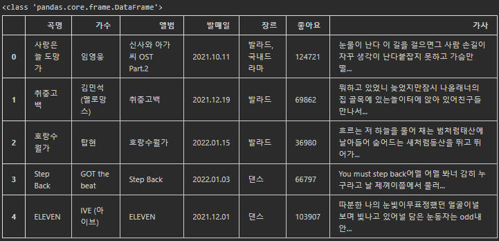 song_df2 = pd.DataFrame(columns=['곡명','가수','앨범','발매일','장르','좋아요','가사'])
