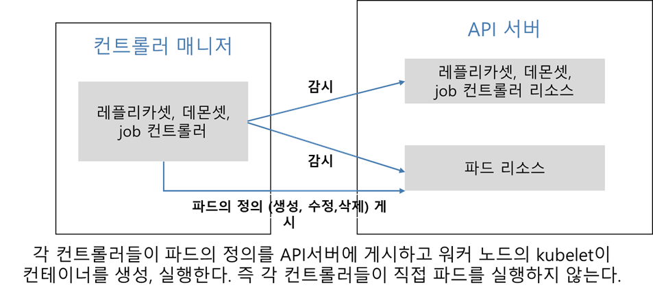 3. 각 컨트롤러는 서로 독립적이며 API서버에 연결해 각 컨트롤러의 리소스에 변경사항이 발생하는지 통보하고 요청한다.